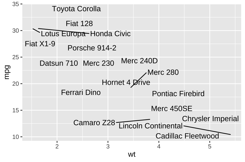 텍스트들이 곁쳐 있는 경우 텍스트들이 겹치는 것을 방지하기 위해 ggrepel 패키지의 geom_text_repel() 함수를 사용할 수 있다.